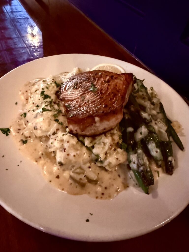 Pan seared swordfish with butternut squash & kale risotto, brussel sprouts, and an oregano mustard cream sauce